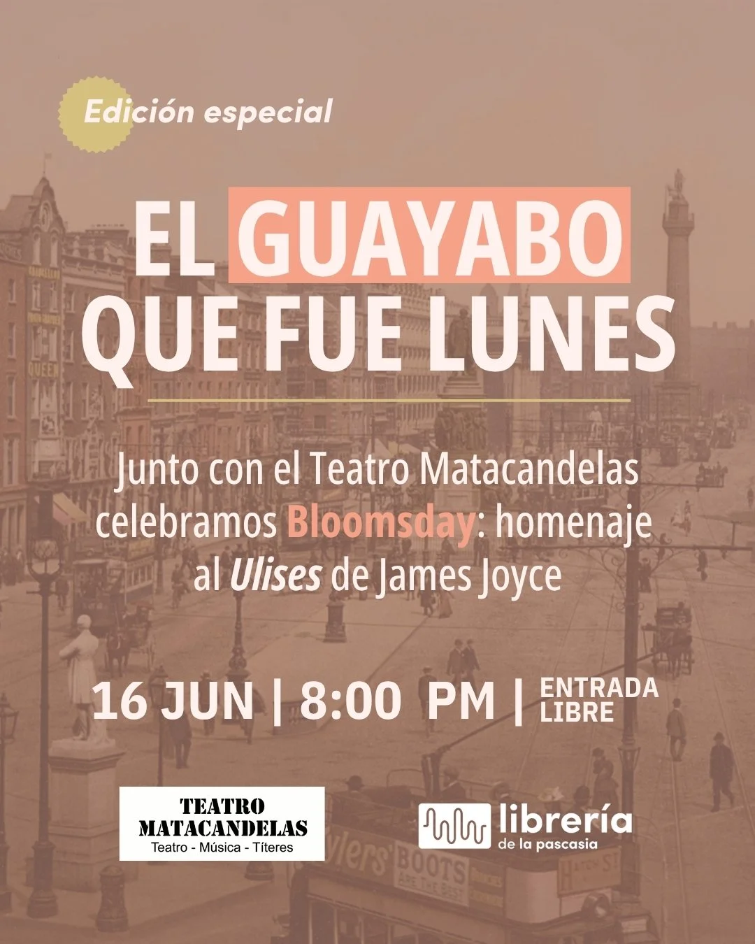 El Guayabo que fue lunes: BLOOMSDAY con el Teatro Matacandelas lunes, 16 de junio de 2025 8:00 p. m. 10:00 p. m. La Pascasia 43-88 Calle 47 Medellín, Antioquia, 050016 Colombia (mapa) Google Calendar ICS
