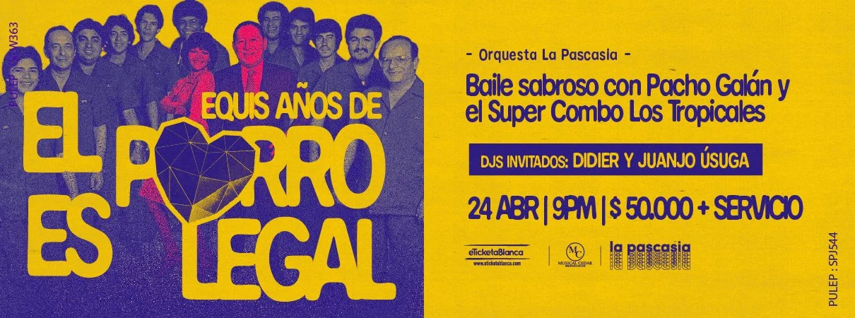 EQUIS AÑOS DE “EL PORRO ES LEGAL” - Baile sabroso con Pacho Galán y El Súper Combo Los Tropicales viernes, 24 de abril de 2026 9:00 p. m. 11:59 p. m. La Pascasia 43-88 Calle 47 Medellín, Antioquia, 050016 Colombia (mapa) Google Calendar ICS