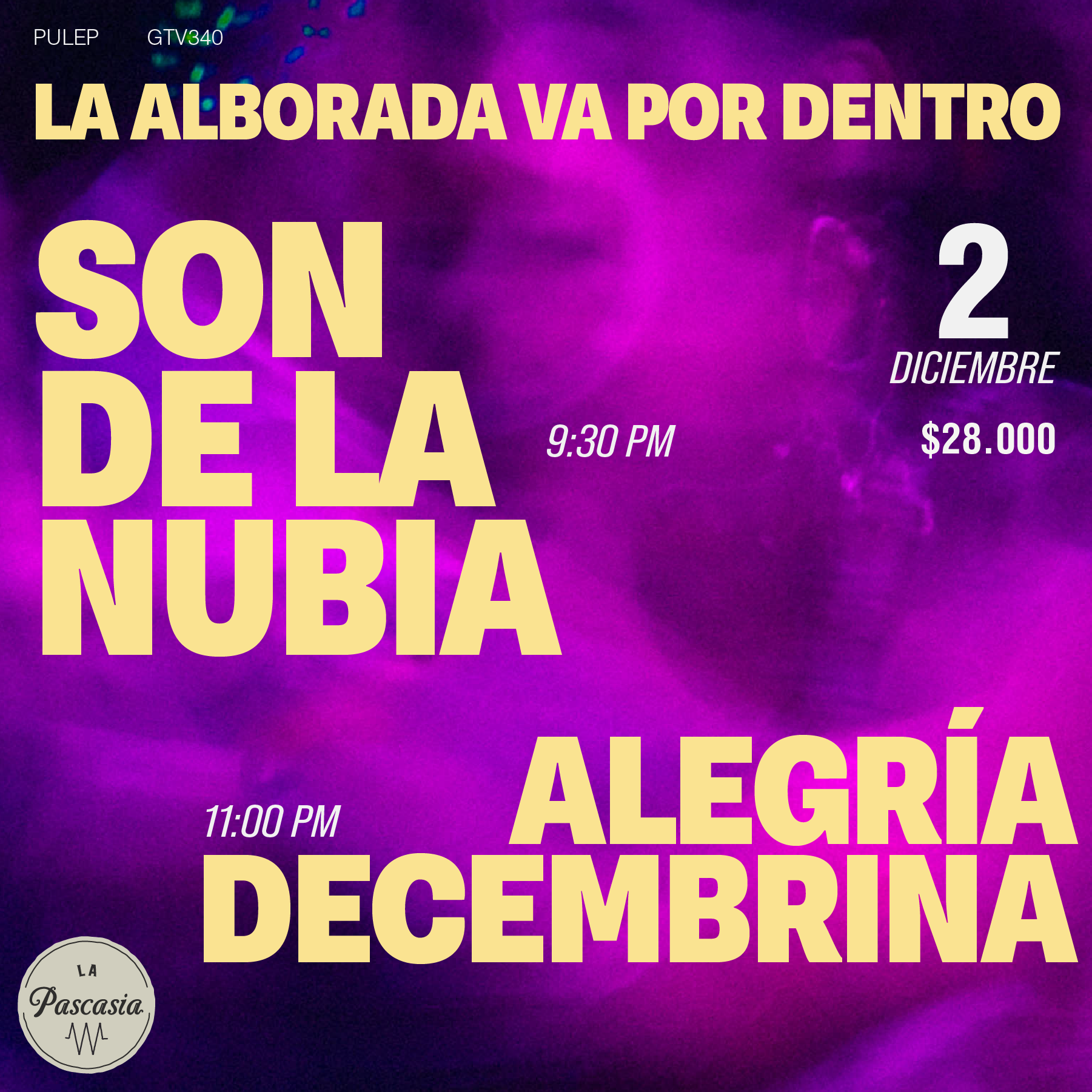 LA ALBORADA VA POR DENTRO SON DE LA NUBIA Y ALEGRÍA DECEMBRINA 9:30 PM / $28.000 viernes, 2 de diciembre de 2022 10:00 p. m. 11:55 p. m. La Pascasia Cra. 42 # 46-46 medellín colombia (mapa) Google Calendar ICS En #LaPascasia la alborada va por dentro y le damos la bienvenida a diciembre bailando y parrandeando de cuenta de la salsa, el son y la timba chocoana de @sondelanubia y la música parrandera antioqueña de Alegría Decembrina. COMPRA TU BOLETA
